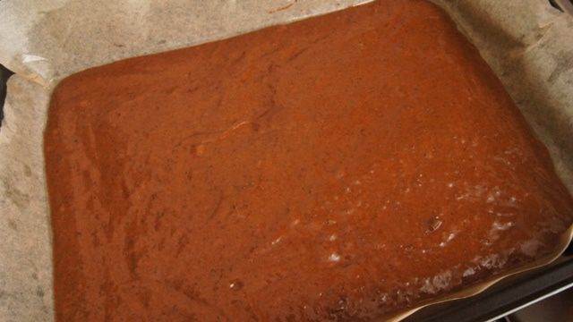 Форму для выпечки (у меня 32х30) выстелить бумагой для выпечки и немного смазать маслом. Вылить тесто и поставить в разогретую до 180°С духовку на 15 минут.