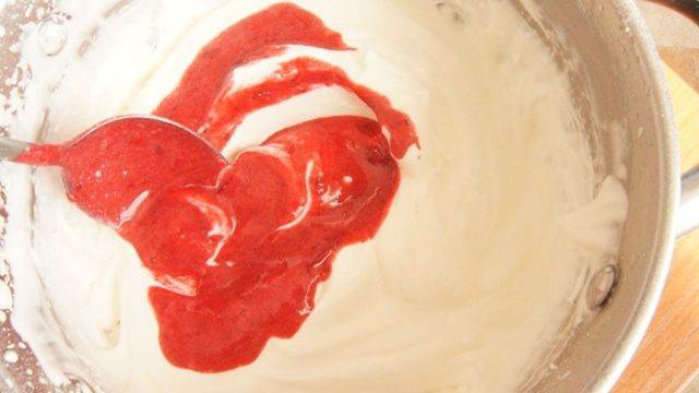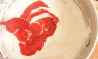 Постепенно ложка за ложкой ввести вишневую начинку к сливкам. Аккуратно перемешать. -