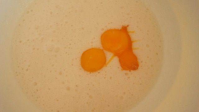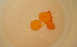Белки взбить до пены. Продолжая взбивать, всыпать частями сахар. Добавить желтки и взбить еще немного. -
