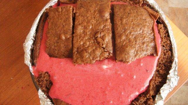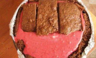 Выкладываем форму фольгой. Разместить крупные куски бисквита плотно друг к другу. Выливаем мусс. Сверху — оставшиеся кусочки бисквита.