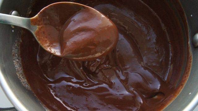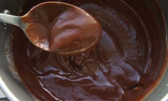 Утром приготовить глазурь. Нагреть в кастрюльке сливки, до кипения. Убрать с огня, добавить поломанный на кусочки шоколад. Дать постоять 5 минут, хорошенько размешать до гладкой однородной массы.