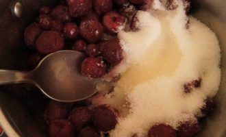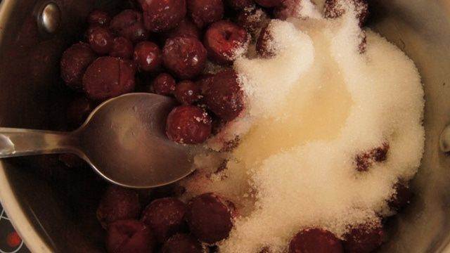 В кастрюле нагреть вишню (не размораживая), всыпать сахар и влить лимонный сок. Помешивая, готовить до растворения сахара. -