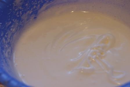 Белки взбить с 50 г. сахара до пиков.