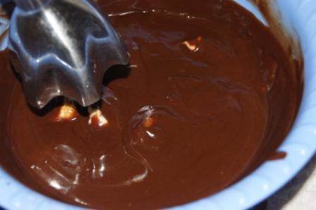 Вливать сливки в шоколад по 1/3, тщательно перемешивая.