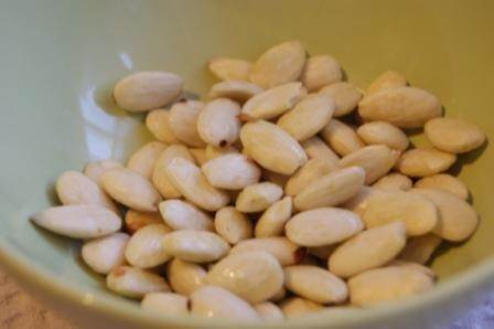 Миндаль очистить от кожицы. для этого залить миндаль кипятком на 3 минуты, затем опустить в ледяную воду на 3 минуты.